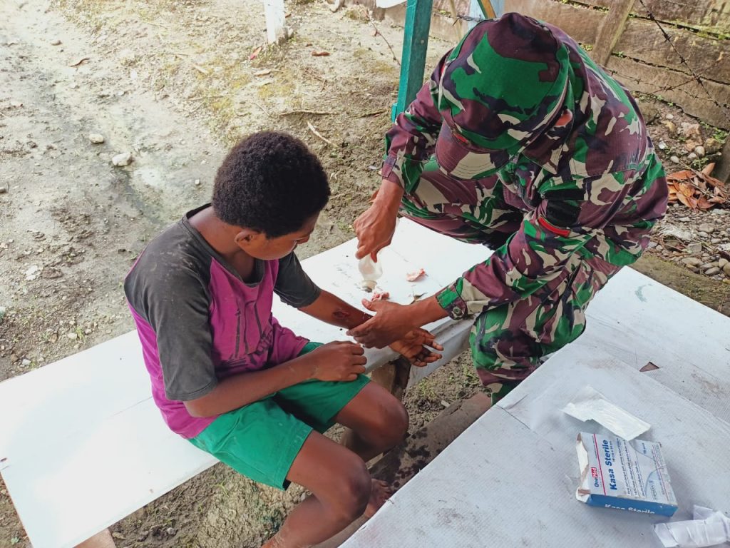 Hal tersebut disampaikan oleh Danpos Waris Letda Inf Muhammad Fauzan Yusuf, S.Tr. (Han) menjelaskan bahwa personel kesehatan Pos w Waris melaksanakan pengobatan luka di bagian tangan kiri Adik Beti Meho (9) yang datang ke pos, terluka akibat terjatuh dari pohon pinang. “Untuk itu, menyikapi hal tersebut, Pratu Pebrinaldi Sihombing selaku Tim Kesehatan langsung memberikan penangan cepat terhadap luka tersebut,” jelasnya.