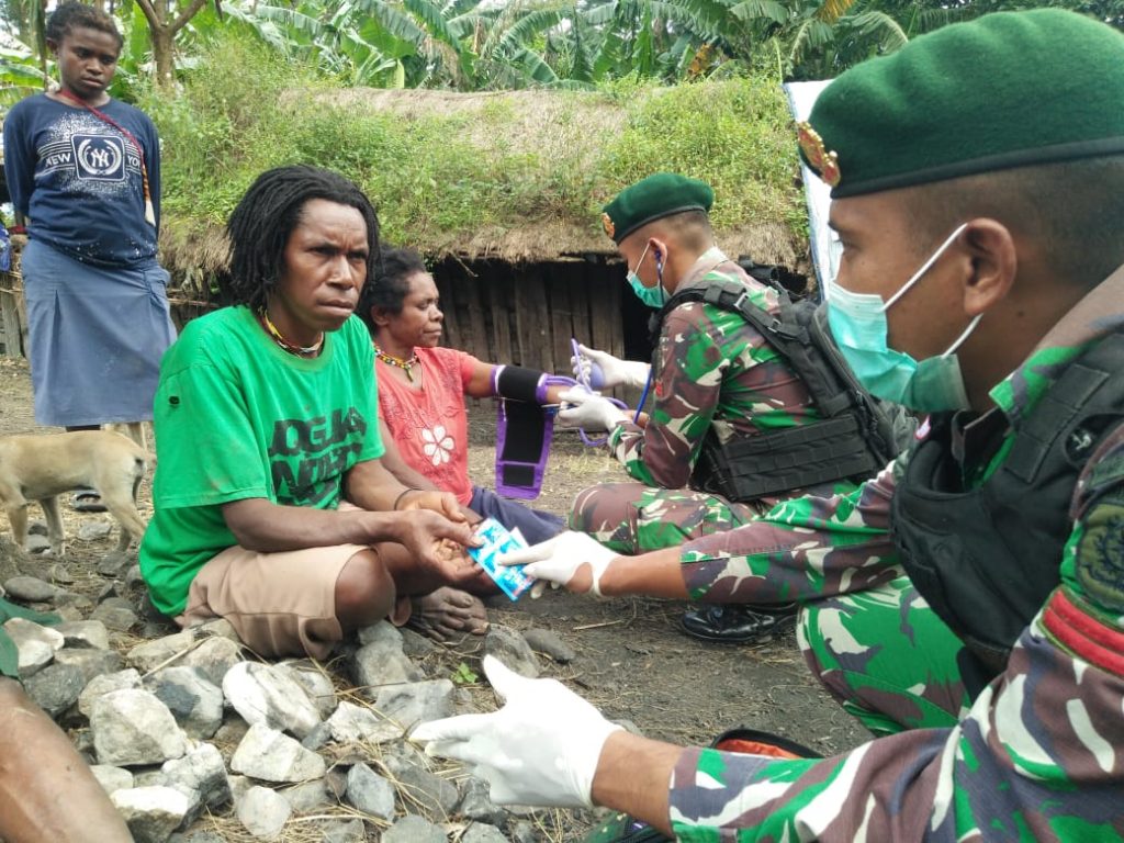 Cuaca yang tidak menentu membuat Tenaga Kesehatan Satgas Yonif Para Raider 432 Kostrad gencarkan memberikan pelayanan kesehatan secara gratis kepada masyarakat dengan berkeliling kampung dan mendatangi rumah-rumah warga guna menjamin kesehatan masyarakat. Distrik Kurulu, Kab. Jayawijaya, Prov. Papua. (17/01/2021).