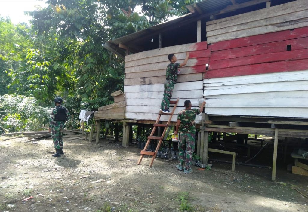 Keerom – Cinta tanah air merupakan rasa kebanggaan, rasa menghormati dan loyalitas yang tinggi yang dimiliki oleh setiap individu pada negara tempat ia tinggal yang dapat tercermin dari perilaku membela tanah airnya, Kali ini, Satgas Pamtas RI-PNG Yonif Raider 100/PS Pos KM 76 melaksanakan pengecatan rumah merah putih di Kampung Uskwar, Distrik Waris, Kabupaten Keerom, Provinsi Papua. Minggu,(17/01/2021) kemarin.
