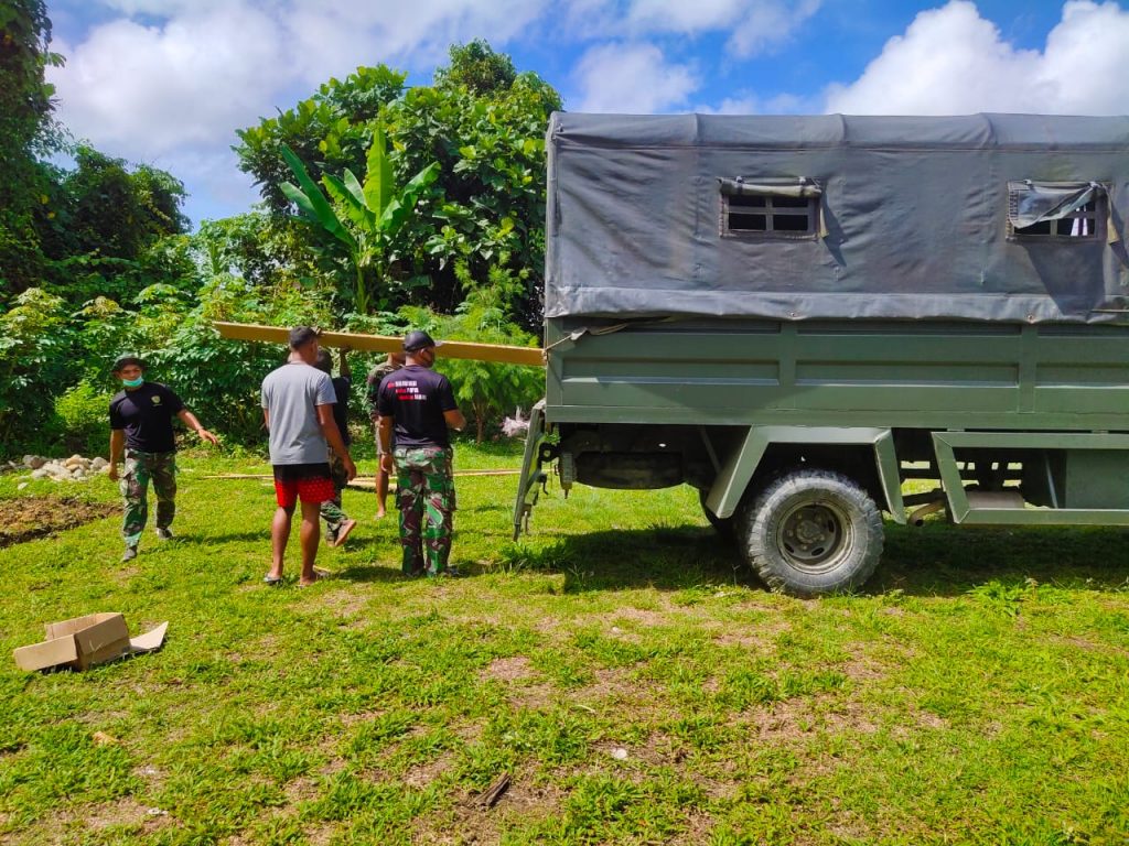 Keerom – Sebagai wujud kepedulian terhadap kegiatan keagamaan warga yang ada di perbatasan, Pos Kotis Satgas Pamtas Yonif 312/Kala Hitam membantu pembangunan tempat doa Gua Maria di Stasi Katolik Paroki Santo Antonius di Kampung SP 2, Distrik Senggi, Kabupaten Keerom, Papua.