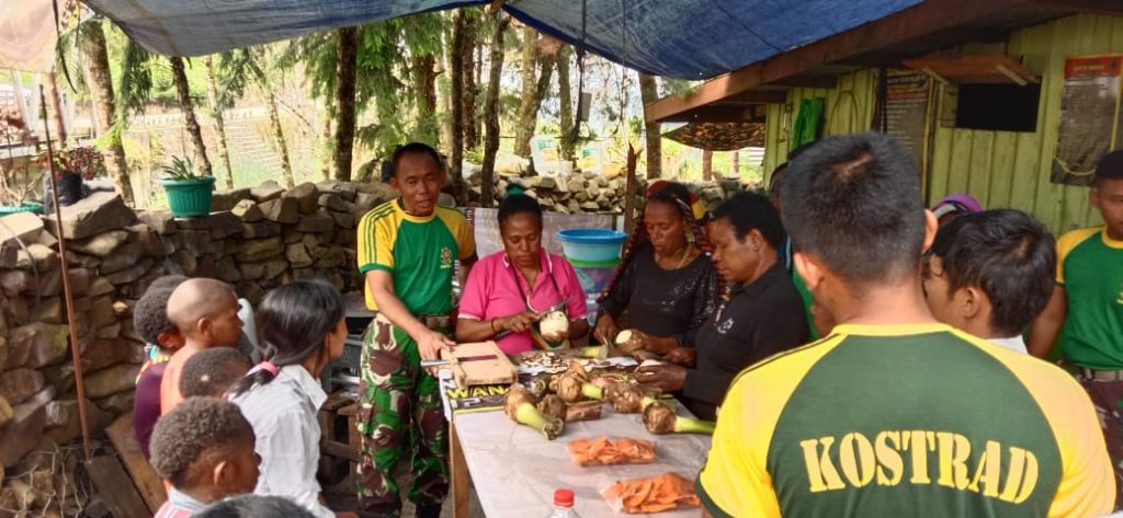 Dengan memanfaatkan hasil perkebunan milik warga, Pos Minage yang dipimpin langsung oleh Danpos Serka Hengkimona bersama masyarakat Minage mengolah buah keladi yang biasanya hanya direbus dan dibakar oleh masyarakat. Tapi dengan kehadiran Pos Minage disulap menjadi Keripik Keladi Cakra Minage . Distrik Kubu, Kab. Tolikara, Papua (09/01/2021).
