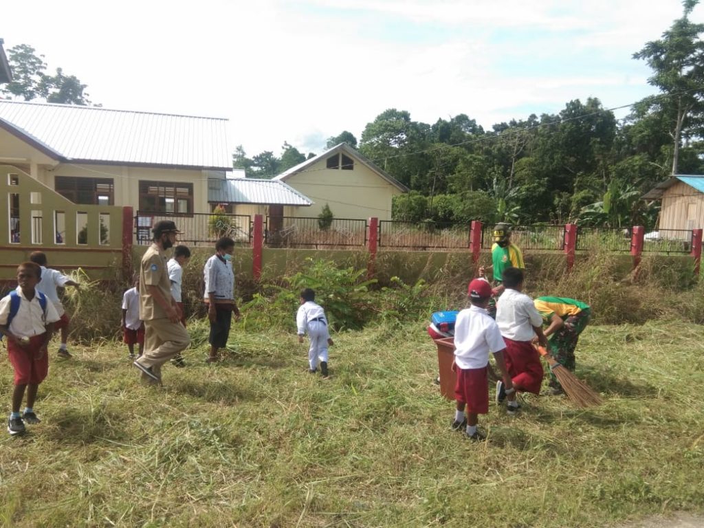 Satgas Pamtas RI-PNG Yonif Mekanis Raider 413 Kostrad Pos Pitewi mengajarkan pola hidup sehat dan bersih kepada siswa SD Negeri Pitewi Distrik Arso Timur Kabupaten Keerom dengan melakukan pembersihan lingkungan Sekolah.