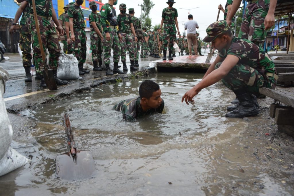Wamena ~ Sebanyak 128 orang Babinsa Kodim 1702 Jayawijaya Dipimpin Danramil 01 Wamena, Mayor Chb Yusuf Rinding, melaksanakan kegiatan Jumat Bersih dengan sasaran pembersihan saluran air/drainase dari sampah yang terbawa arus, sehingga menumpuk dan menghalangi saluran di sepanjang Jl. Trikora, Wamena.