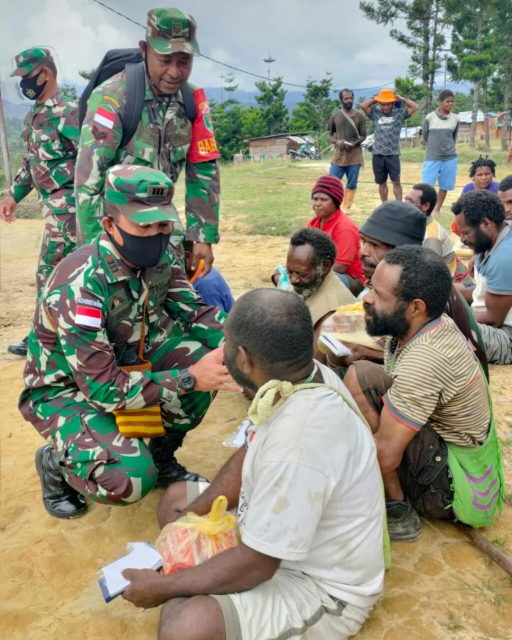 Danramil 1715-01/Oksibil dalam kegiatan nya melakukan bakti sosial dengan membagikan 120 Alkitab, 120 paket sembako dan 120 paket snack serta membagikan 120 masker kepada masyarakat Kampung Yunabol.