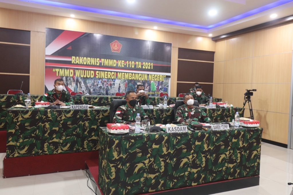 Abepura,Kamis (18/2).– Kepala Staf Kodam (Kasdam) XVII/Cenderawasih Brigjen TNI Bambang Trisnohadi bersama Komandan Korem (Danrem) 172/PWY Brigjen TNI Izak Pangemanan mengikuti Kegiatan Rapat Koordinasi Teknis (Rakornis) TNI Manunggal Membangun Desa (TMMD) Ke-110 tahun 2021, bertempat di Aula Puskodalops Makodam XVII/Cenderawasih.