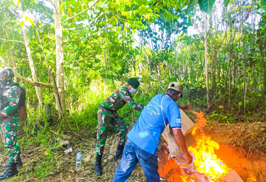 Bersama petugas medis dan elemen masyarakat, anggota Satgas Yonif Para Raider 432/WSJ/3/3 Kostrad melaksanakan pemusnahan obat kadaluarsa yang beredar di daerah Distrik Bonggo Timur, Kab. Sarmi, Prov. Papua (12/02/2021)