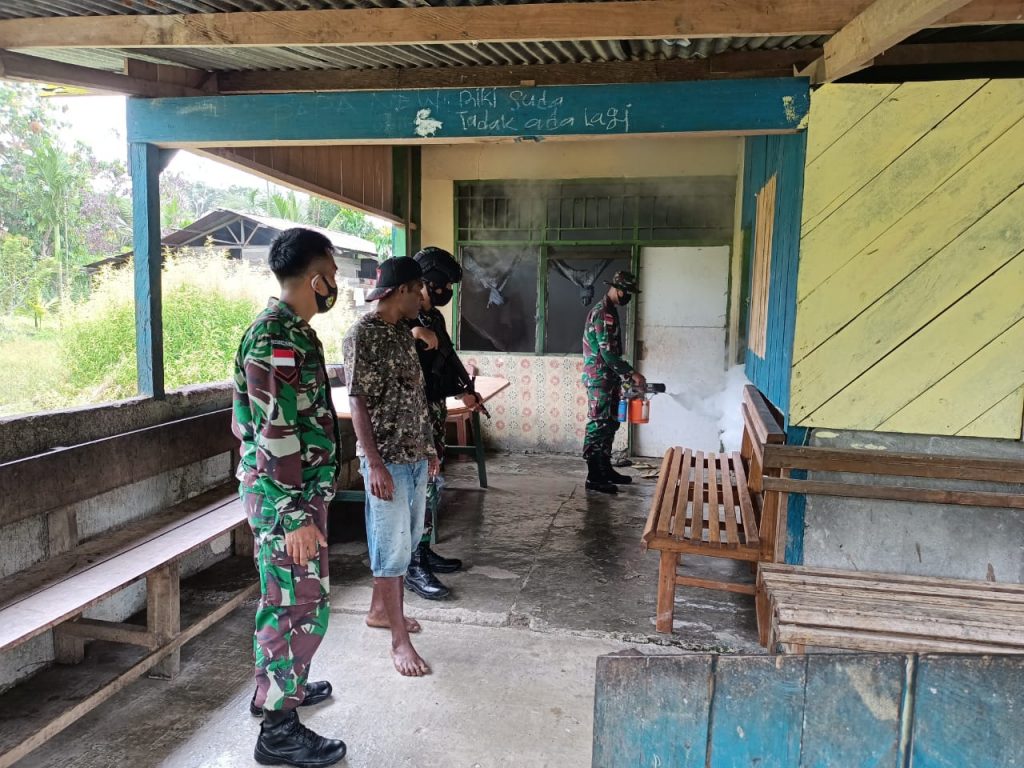 Keerom – Sebagai langkah untuk mencegah penyebaran penyakit malaria di perbatasan, personil kesehatan Pos Bompay Satgas Pamtas Yonif 312/Kala Hitam melakukan kegiatan fogging terhadap rumah-rumah warga di Kampung Bompay, Distrik Waris, Kabupaten Keerom, Papua.