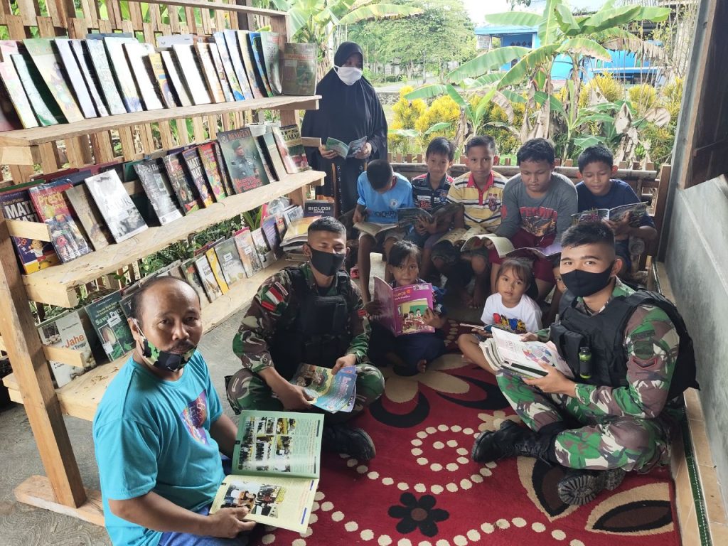 Sementara itu, kegiatan tersebut dipimpin oleh Serda A. Zendrato bersama 6 anggotanya, menyerahkan buku pelajaran tersebut diperpustakaan mini milik Bapak Mulyadi. Awalnya anak-anak sangat senang datang beramai-ramai untuk membaca buku diperpustakaan mini tersebut, melihat masih banyak buku yang kurang, Satgas Pos Kotis tergerak turut menyumbangkan buku pelajaran. “Mungkin tidak seberapa jumlah buku yang kami berikan, namun kami berharap buku tersebut dapat bermanfaat sehingga tidak perlu lagi mereka membelinya dari Kota hanya sekedar untuk belajar dan menulis. Semoga buku tersebut dapat bermanfaat untuk anak-anak dalam meraih cita-citanya,” ungkapnya.