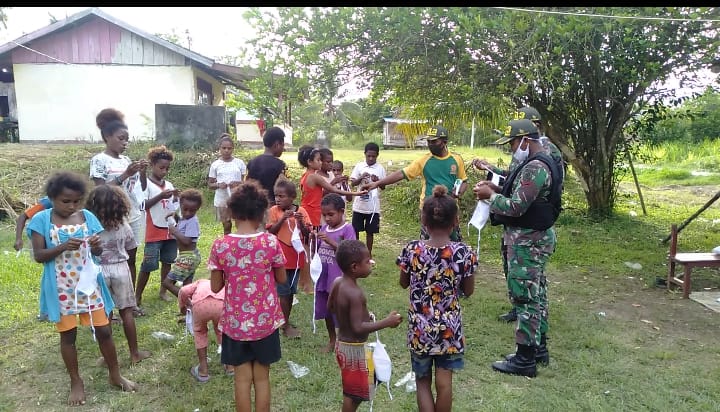 Satgas Pamtas RI-PNG Yonif Mekanis Raider 413 Kostrad Pos Mosso mengajak anak-anak di Kampung Mosso Distrik Muara Tami Kota Jayapura untuk belajar dan bernyanyi bersama dengan tetap memperhatikan protokol kesehatan.