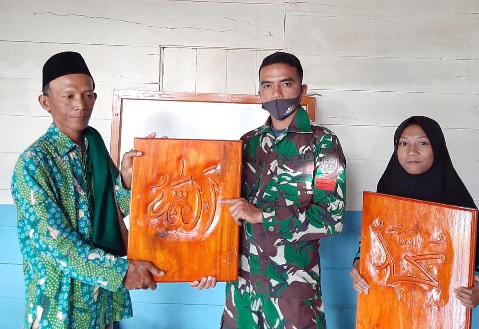 Keerom – Jelang pelaksanaan purna tugas, Pos Komando Taktis (Kotis) Satgas Satgas Pamtas Yonif 312/Kala Hitam memberikan kenang-kenangan berupa ukiran kaligrafi kepada salah satu tokoh agama di Kampung Senggi, Distrik Senggi, Kabupaten Keerom, Papua.