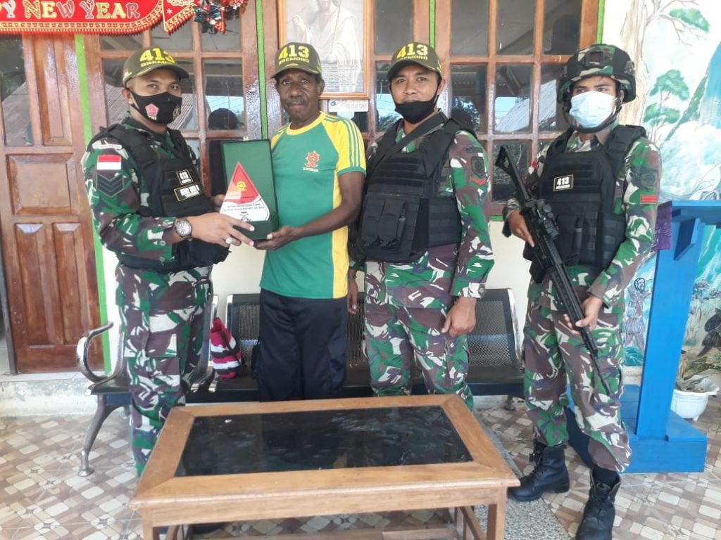 Menjelang purna Tugas Operasi Pengamanan Perbatasan di Sektor Utara Papua, Satgas Pamtas RI-PNG Yonif Mekanis Raider 413 Kostrad Pos Koya Koso memberikan cinderamata berupa topi dan plakat kepada masyarakat di Kampung Koya Koso Distrik Abepura Kota Jayapura.