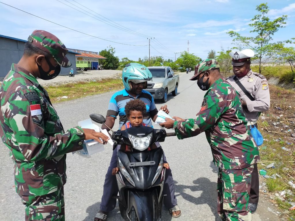 Kamis, 4 Februari 2021, Kapten Inf Maraden Thomson Panjaitan selaku Pjs Pasi-2/Ops Kodim 1715/YKM beserta 20 orang anggota Kodim dan Koramil 1715-06/Dekai turun ke jalan untuk menghimbau pentingnya protokol kesehatan dan menggunakan masker.