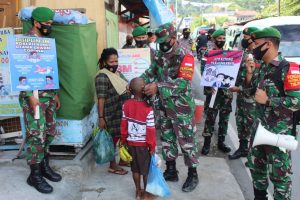WUJUDKAN MASYARAKAT DISIPLIN, KODIM 1702/JAYAWIJAYA BAGIKAN MASKER DAN BERIKAN SOSIALISASI KESEHATAN