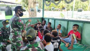 Meluangkan waktu bermainnya, anak-anak di Kampung Nafri Distrik Abepura Kota Jayapura mengunjungi Pos Nafri Satgas Pamtas RI-PNG Yonif Mekanis Raider...