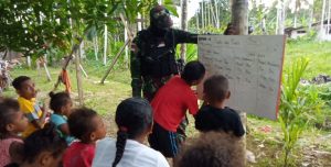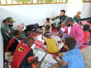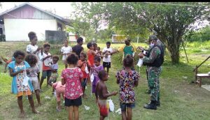 Satgas Pamtas RI-PNG Yonif Mekanis Raider 413 Kostrad Pos Mosso mengajak anak-anak di Kampung Mosso Distrik Muara Tami Kota Jayapura...