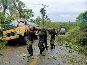 Keerom - Personel Pos Komando Utama (Kout) Satgas Yonif 312/KH turun tangan membantu mengevakuasi sejumlah pohon tumbang akibat hujan dan...
