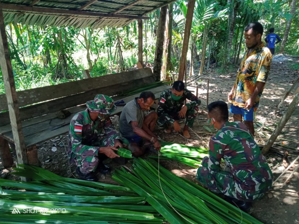 Keerom – Wujud nyata kemanunggalan serta kedekatan warga dan prajurit TNI, personil Pos Somografi Satgas Pamtas Yonif 312/KH melaksanakan anjangsana sekaligus saling berbagi ilmu mengenai cara pembuatan atap rumbia di Kampung Somografi, Distrik Web, Kabupaten Keerom, Papua.