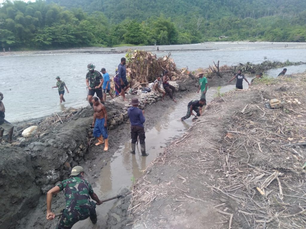 Pegunungan Bintang – Prajurit Pos Batom Satgas Pamtas Yonif 312/KH bersama warga saling bahu membahu melaksanakan karya bakti pembuatan saluran irigasi di Kampung Batom, Distrik Batom, Kabupaten Pegunungan Bintang, Papua.