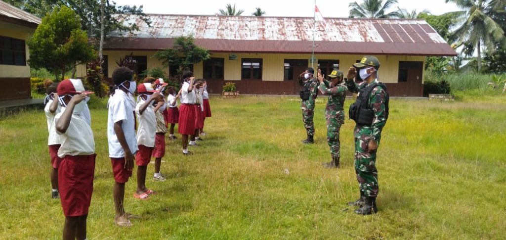 Satgas Pamtas RI-PNG Yonif Mekanis Raider 413 Kostrad Pos Mosso memberikan bantuan tenaga pendidik, mengajarkan tata cara peraturan baris Berbaris (PBB) yang baik dan benar kepada siswa SDN Mosso Distrik Muara Tami Kota Jayapura.