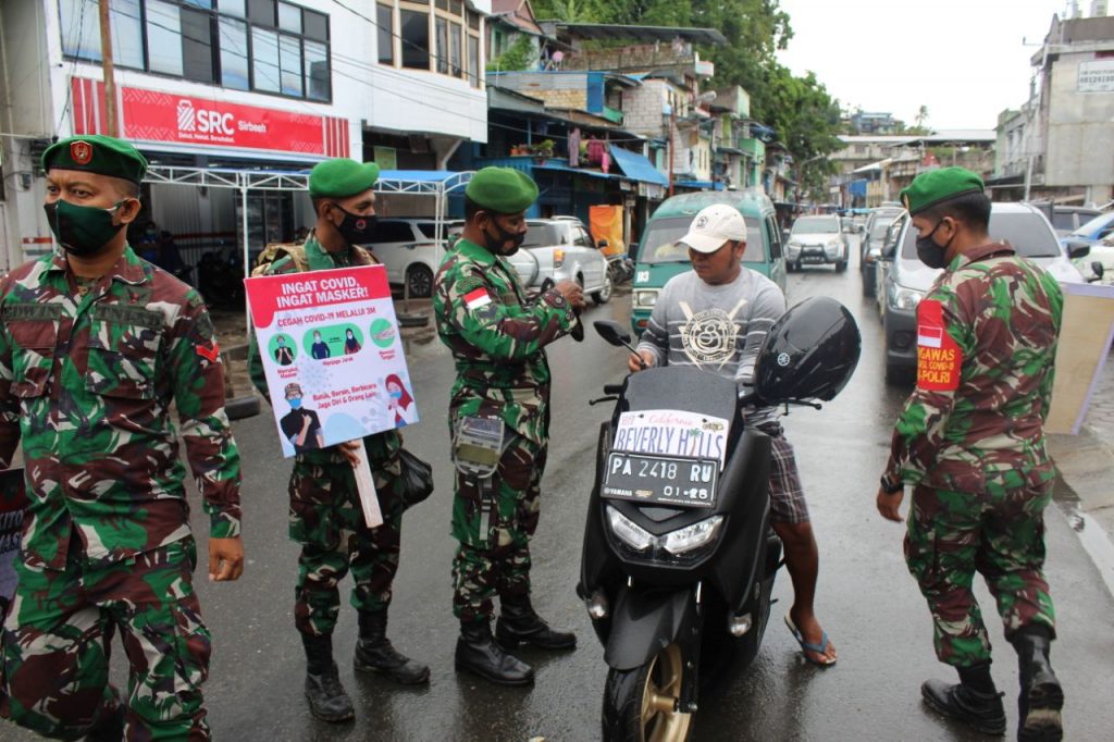 Tergabung dalam satgas pencegahan Covid-19, Kodim Jayapura terus intens melaksanakan patroli dan mensosialisasikan Protokol Kesehatan serta penerapan 3M dalam setiap aktifitas di luar rumah.