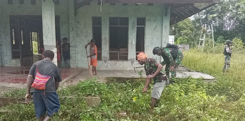Keerom – Sebagai wujud kepeduliannya terhadap keindahan dan kebersihan kampung serta mempererat tali persaudaraan, Satgas Yonif Raider 100/PS Pos Yabanda dan warga kampung, melaksanakan kegiatan Karya Bhakti di balai desa Kampung Yabanda, Distrik Yaffi, Kabupaten Keerom, Provinsi Papua. Jumat, (05/02/2021).