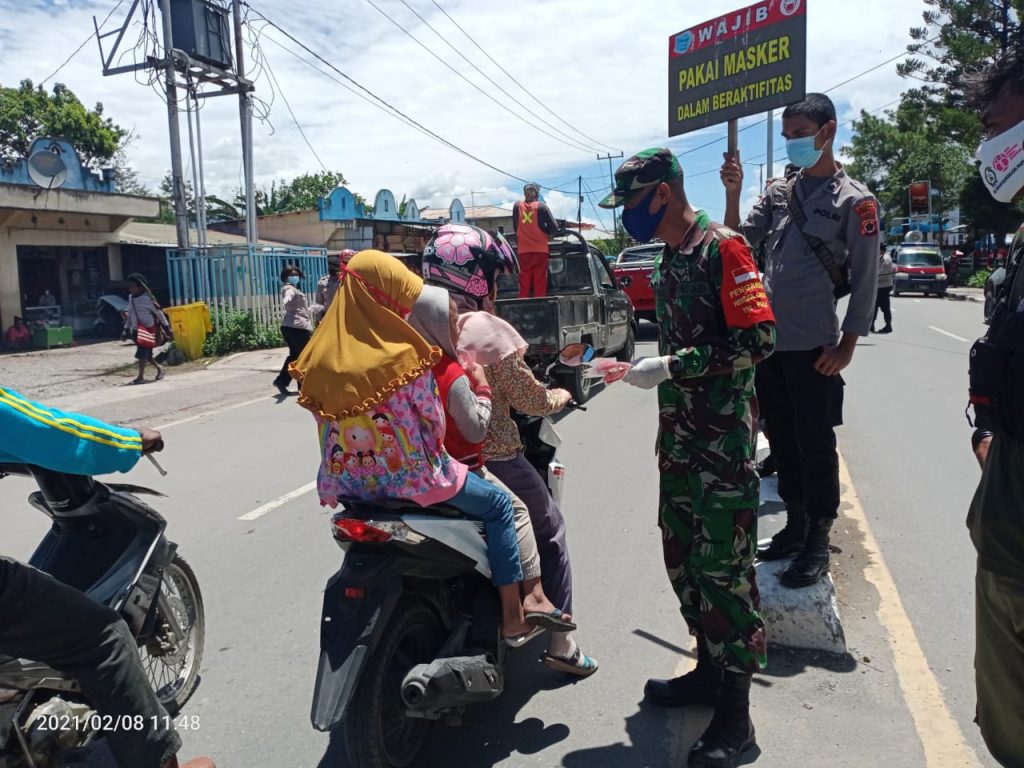 Sertu Y.A Pratama Babinsa Kodim 1702/Jayawijaya selain memberikan himbauan dan menerapkan protokol kesehatan juga membagikan 3000 masker kepada masyarakat dengan tujuan untuk menyadarkan dan mendisiplinkan masyarakat dalam melaksanakan protokol kesehatan.