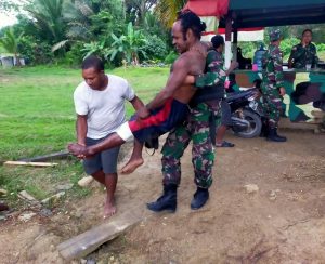Keerom – Dokter Satgas Yonif Mekanis 512/QY Lettu Ckm dr. M. Effendy Nugraha Hasibuan memberikan pengobatan kepada Yere Kogoya (45)...