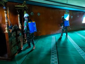 SAMBUT BULAN SUCI RAMADHAN PADA MASA PANDEMI COVID19, TNI LAKUKAN PENYEMPROTAN DISINFEKTAN DI MASJID