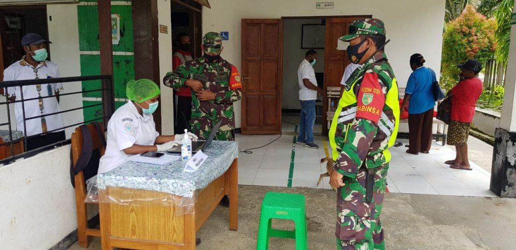 Demi mensukseskan dan kelancaran proses vaksinasi dipuskesmas Depapre Kodim 1701/Jayapura mengerahkan babinsanya Sertu Lamhot Sianturi bersama Koptu Edy Setiawan memdampingi kegiatan vaksinasi bertempat di puskesmas Depapre distrik Depapre kabupaten Jayapura,Sabtu (27/03/2021)