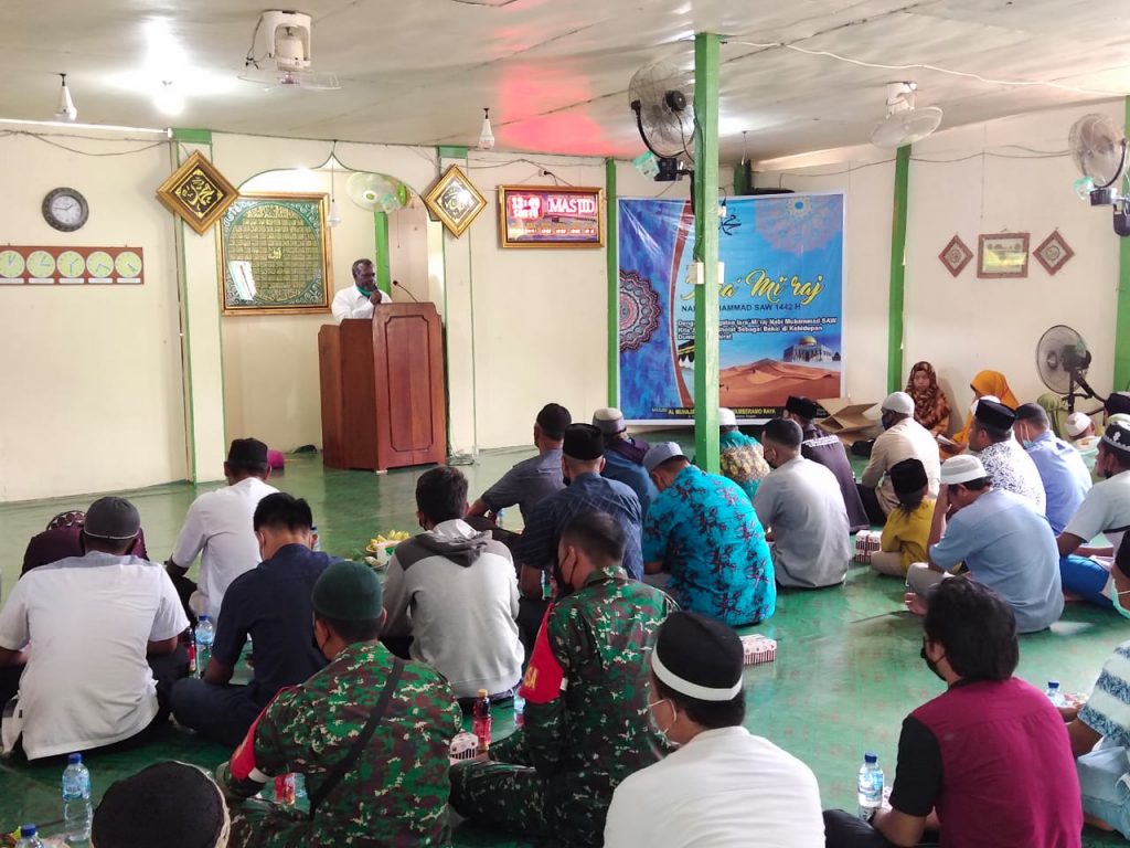 Sarmi (14/03/2021) Babinsa Koramil 1712-04/Mamberamo Hilir (Arbais) Kodim 1712/Sarmi Sersan Satu Hasan beserta 5 orang Babinsa jajaran Distrik Mamberamo Tengah menghadiri Acara Peringatan Isra’ Mi’raj Nabi Muhammad SAW, bertempat di Masjid Al-Muhajirin Burmeso Distrik Mamberamo Tengah Kabupaten Mamberamo Raya.