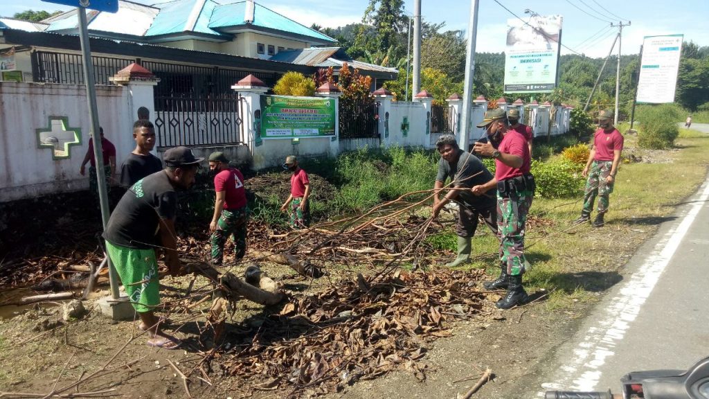 Dipimpin Lansung oleh Dankipur D lettu Inf Jinopen Arman beserta 10 orang anggota bersama dengan masyarakat dan petugas Puskesmas Distrik Muara Tami melaksanakan kerja bakti di lingkungan puskesmas.