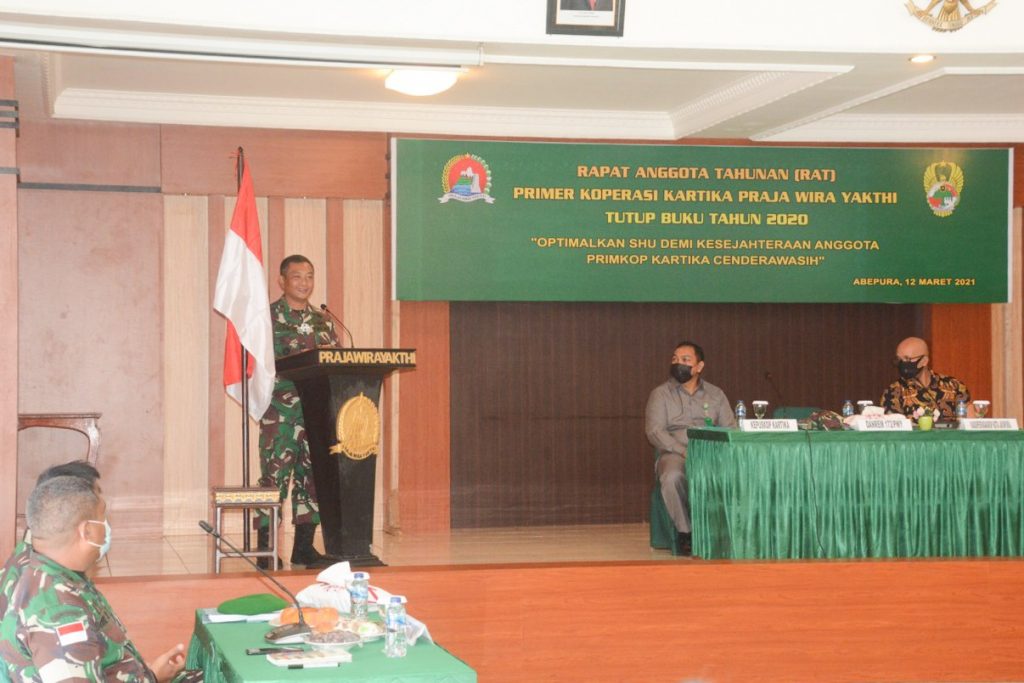 Abepura – Korem 172/PWY menggelar Rapat Anggota Tahunan (RAT) Primkop Kartika Praja Wira Yakthi tutup buku tahun 2020 bertempat di Aula Praja Wira Yakthi, Kota Jayapura, Jumat (12/3).