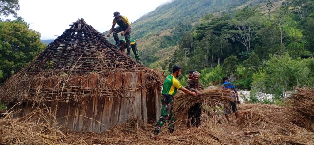 Demi untuk kenyamanan masyarakat, Satgas Yonif Para Raider 432/3/3 Kostrad melaksanakan perehaban honai adat yang di pimpin oleh Letda Inf Dennis Akbar bersama 10 anggotanya di Kampung Obolma, Distrik Kurima, Kab. Yahukimo. (17/03/2021)