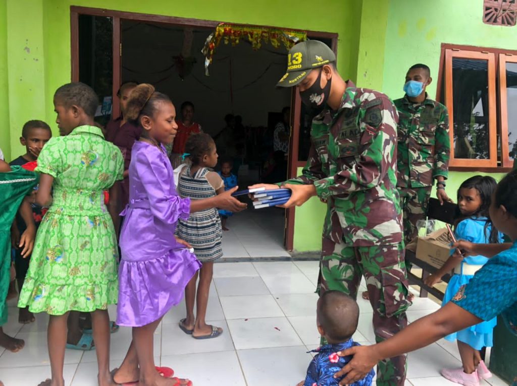 Satgas Pamtas RI-PNG Yonif Mekanis Raider 413/BRM Kostrad melalui Pos Kaliasin membagikan buku Alkitab kepada masyarakat bertempat di Gereja Santo Mikael Kampung, Kampung Kibay, Distrik Arso Timur, Kabupaten Keerom.