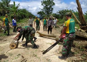 Satgas Pamtas RI-PNG Yonif Mekanis Raider 413 Kostrad melalui Pos Kout KM 31 menggelar kegiatan Karya Bhakti pembersihan jalan bersama...
