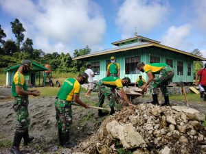 Satgas Pamtas RI-PNG Yonif Mekanis Raider 413 Kostrad melalui Pos Pitewi menggelar kegiatan Karya Bhakti perbaikan akses jalan di sekitar...