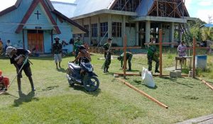 Keerom - Satgas Pamtas Yonif Mekanis 512/QY mengajak masyarakat Karya Bhakti di lingkungan Gereja GKI IRENE di Kampung Naramben, Distrik...