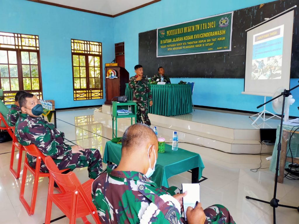 Sementara itu Penyuluh Hukum Kasituud Kumdam XVII/Cenderawasih (Mayor Chk Muchis Fauzie S.H.) menyampaikan bahwa, kegiatan penyuluhan hukum ini di laksanakan seluruh satuan yang ada di wilayah Kodam XVII/Cenderawsih. Kegiatan ini bertujuan untuk memberikan pengetahuan, gambaran, sosialisasi serta wawasan, sehingga diharapkan dapat meminimalisir pelanggaran dan menumbuhkan kesadaran hukum dalam setiap individu Prajurit maupun PNS TNI serta keluarganya dan dapat menerapkan dalam kehidupan sehari-hari,” tegasnya.