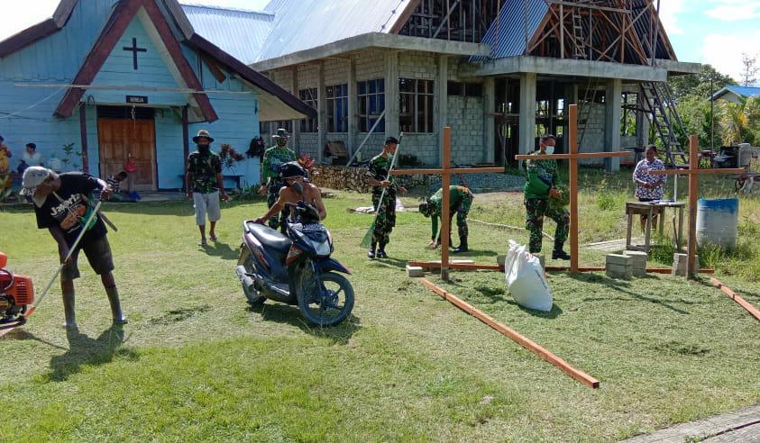 Keerom – Satgas Pamtas Yonif Mekanis 512/QY mengajak masyarakat Karya Bhakti di lingkungan Gereja GKI IRENE di Kampung Naramben, Distrik Skanto, Kabupaten Keerom, Papua.