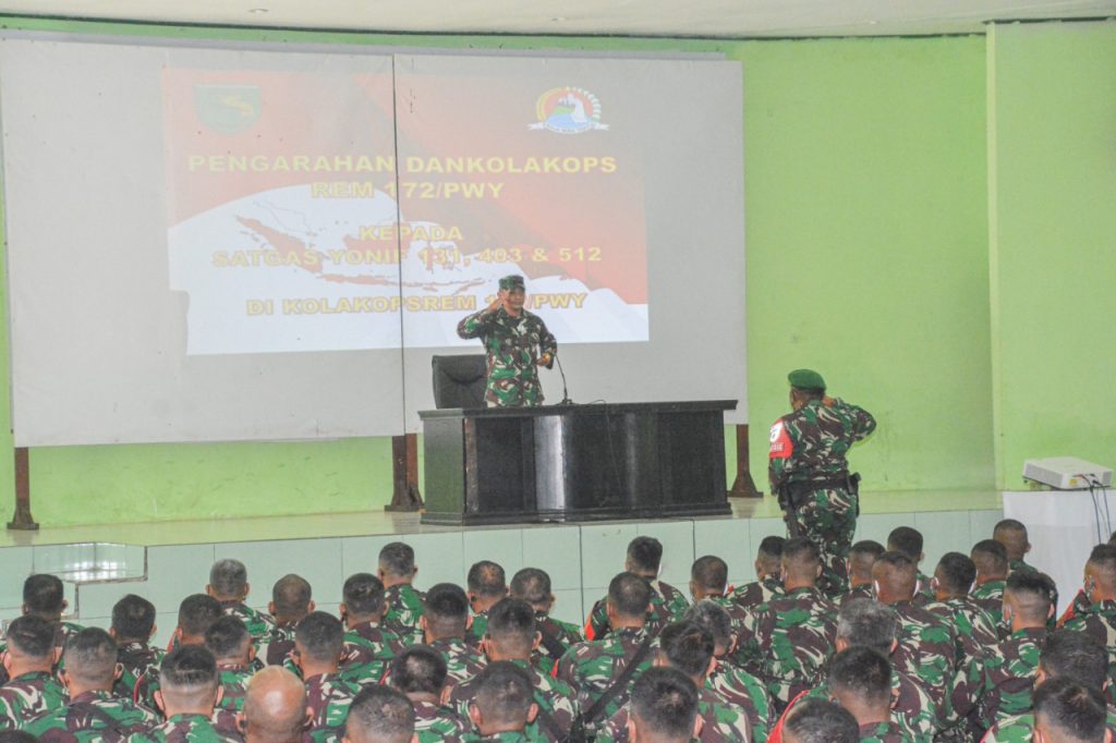 Abepura – Komandan Korem (Danrem) 172/PWY selaku Komandan Komando Pelaksana Operasi (Dankolakops) memberikan pembekalan kepada tiga Batalyon Satgas Pamtas RI-PNG yang akan melaksanakan tugas menggantikan satgas lama di wilayah Korem 172/PWY, bertempat di Rindam XVII/Cenderawasih, Jayapura, Rabu (10/3).