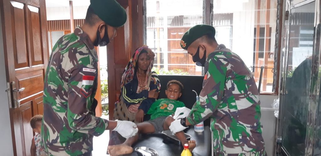 Oksibil – Pos Batom Satgas Pamtas Yonif 403/Wirasada Pratista turut membantu upaya tenaga kesehatan Puskesmas dalam menyehatkan masyarakat Papua di Distrik Batom.