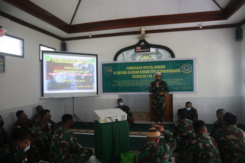 Abepura,- Dalam rangka meningkatkan keimanan dan ketaqwaan Prajurit, Korem 172/PWY melalui Bintalrem 172/PWY melaksanakan pembinaan mental rohani di Mushola Istiqomah Makorem 172/PWY. Selasa, (02/03/2021).