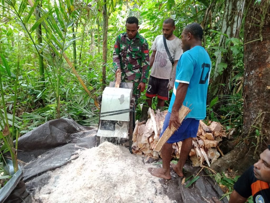 Pada kesempatan ini saya membantu proses pengolahan sagu milik bapak Daniel Buriam, sekaligus belajar tentang cara menogok Sagu untuk di jadikan pati dari pohon sagu. Ternyata dalam pengolahanya membutuhkan waktu dan proses panjang. Apa yang saya lakukan ini guna beradaptasi dengan lingkungan dan sebagai Babinsa saya harus bisa menyesuaikan dengan kegiatan masyarakat,” tutur Babinsa Kampung Anus Praka Waicang.