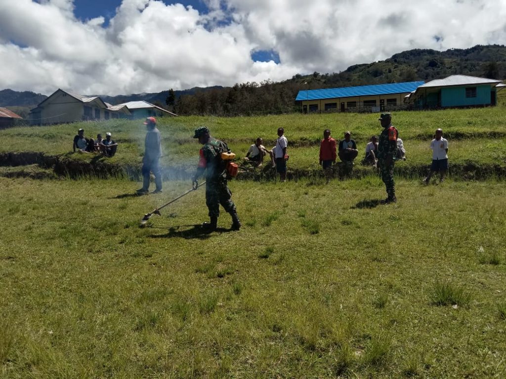 Tiom ~ Prabinsa Koramil 1702-04/Tiom,Prada Napu bersama Prada Wakur,melaksanakan kerja bakti di lapangan Smp Negeri 4 Yokobak,Distrik Yokobak,Selasa(06/04/2021).