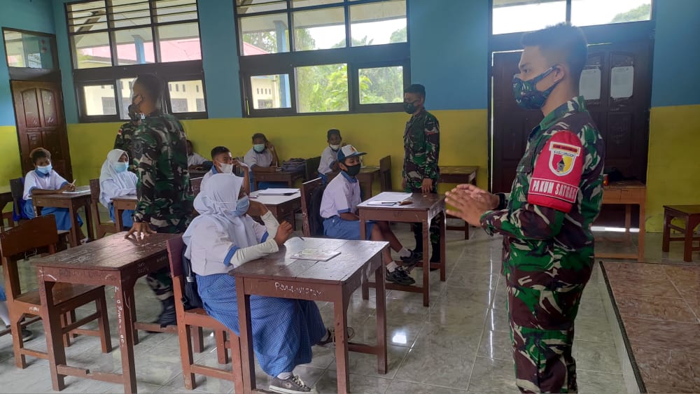 Keerom – Dalam rangka meningkatkan kualitas pendidikan bagi generasi penerus bangsa di wilayah perbatasan Papua, Komandan Yonif Mekanis 512/QY, Letkol Inf. Taufik Hidayat memerintahkan Perwira Hukum (Pakum) Satgas Pamtas RI-PNG untuk membantu Proses belajar mengajar di SMP V Arso, Pir IV Distrik Mannem, Kabupaten Keerom, Papua.