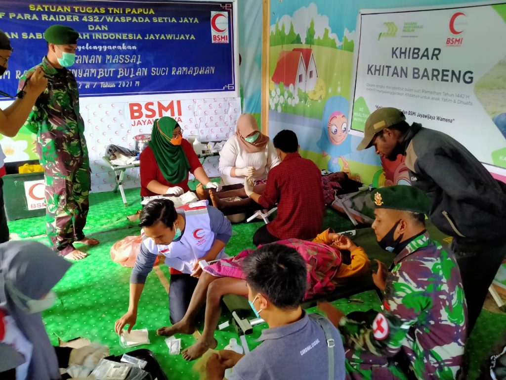 Yahukimo – Sambut Bulan Suci Ramadhan Satgas Yonif Para Raider 432/3/3 Kostrad kali ini bekerja sama dengan Bulan Sabit Merah Indonesia (BSMI) gelar acara “Khibar” (Khitan Bareng) yang diselenggarakan di Kampung Hitigama, Distrik Hitigama, Kab. Yahukimo. (11/04/2021)
