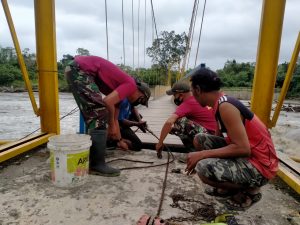 Keerom - Prajurit TNI Satgas Pamtas Yonif 131/Brs Pos Bendungan Tami kampung Arso Kab. Keroom bantu memperbaiki jembatan yang rusak...
