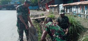 Karubaga~Babinsa Koramil 1702-08/Karubaga,Dpp Sertu Anwar Useng bersama anggota sedang melaksanakan kegiatan kerja bakti/ pembersihan selokan yang tertimbun sampah akibat curah...