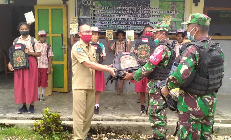 Keerom – Dalam rangka meningkatkan semangat anak-anak untuk menuntut ilmu di perbatasan Papua, Satgas Pamtas RI-PNG Yonif Mekanis 512/QY membagikan buku tulis dan tas sekolah kepada siswa di SD PGRI Yamara di Kampung Yamara, Distrik Mannem, Kabupaten Keerom.