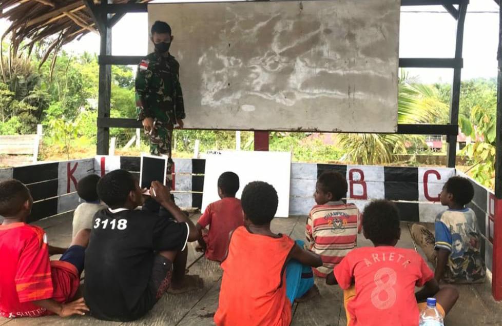 Keerom – Dalam rangka membantu pemerintah meningkatkan kualitas pendidikan anak-anak di wilayah perbatasan, Satgas Pamtas RI-PNG Yonif Mekanis 512/QY Pos Yabanda memberikan bimbingan belajar kepada anak-anak di ruang belajar Pos Yabanda Distrik Yaffi, Kabupaten Keerom, Papua.